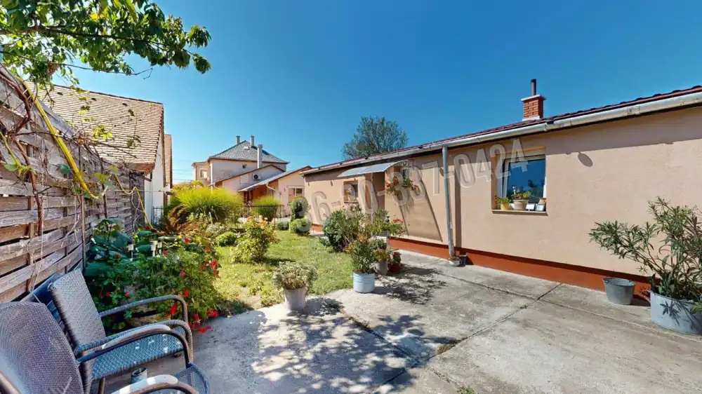 A telek rendkívül gondosan karbantartott, minden területe logikusan, átgondoltan került kihasználásra. Megvan a helye a tárolásnak, kertnek, autóknak. Az udvar térkővel burkolt, a zöld területek ápoltak. A locsolást egy 42 m mély fúrt kút teszi lehetővé.