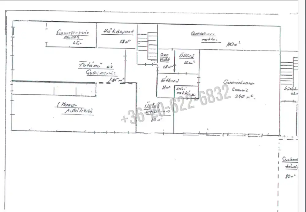 - Földszint: korábban modern gumis- és diagnosztikai műhely + műszaki vizsgabázis (2×~240 nm), középen ügyféltér + szociális blokk (~150 nm), hátsó raktár (~200 nm).